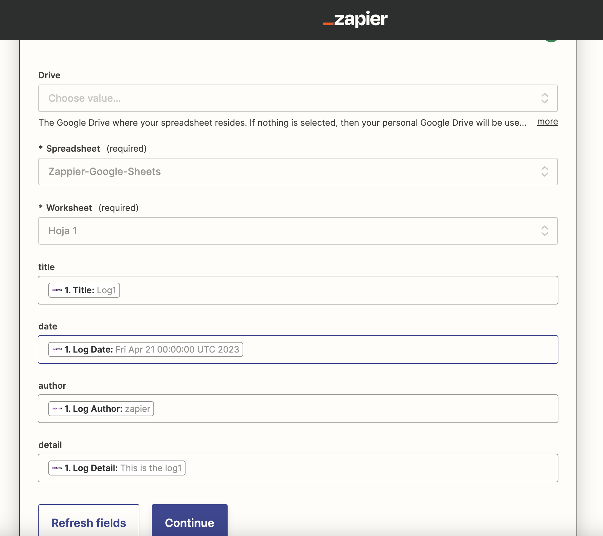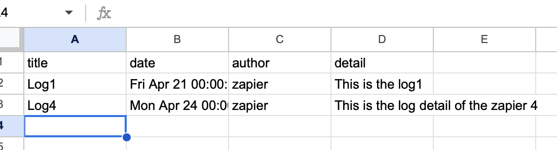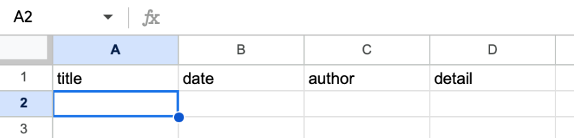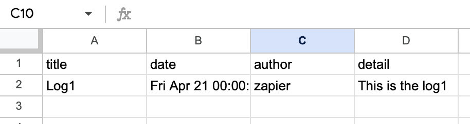 Before we continue, open up a new Google Sheet in the account you've connected, and set a few values into the header row to represent the Log fields: title, date, author, detail.