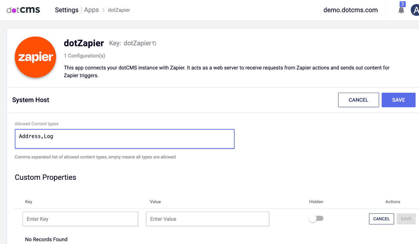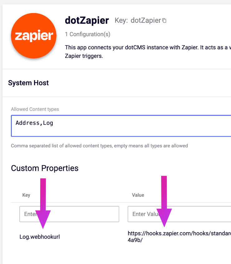 Back in dotCMS, if you return to the dotZapier App, you'll notice that it now displays a webhook URL. This row has been added by Zapier, and represents the registration of the Zap we created in our dotcms instance; its key is the Content Type variable we selected, plus the keyword webhookurl; its value is the zapier webhook that resulted.