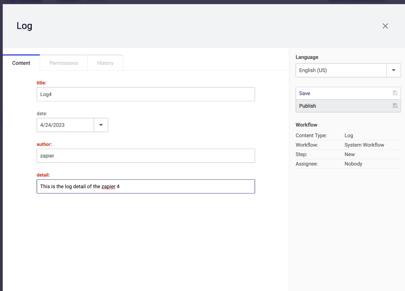 Here we'll select Log. The contentlets you created earlier should be detected by Zapier at this time.