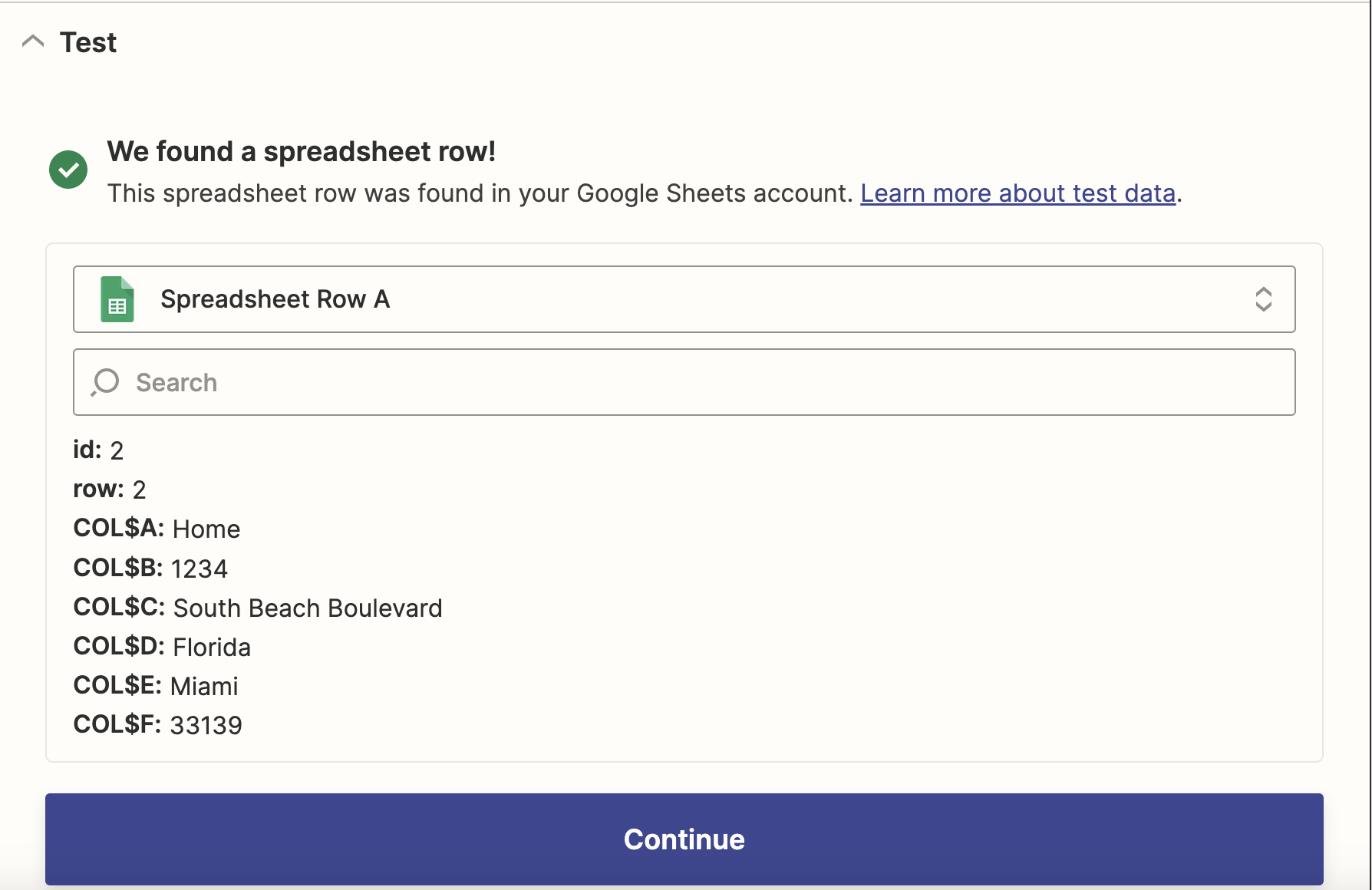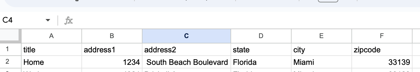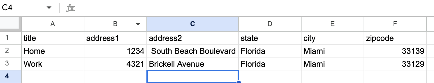 Before continuing, make a second worksheet within your test document (or create another document entirely) to correspond to the new Zap. This will prevent a looping condition that can result if the two Zaps are working off the same set of rows. This time, make the first row into a series of column headings corresponding to the Address content type: title, address1, etc.