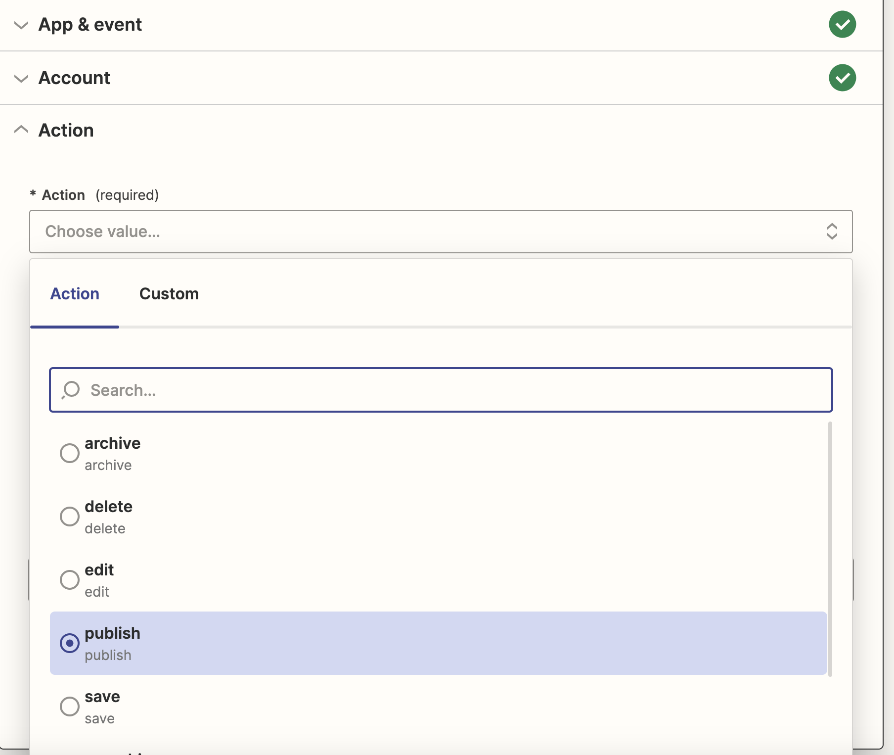 For the action, you can select a dotCMS Workflow Action to specify when a new spreadsheet row is detected. We'll pick Publish.