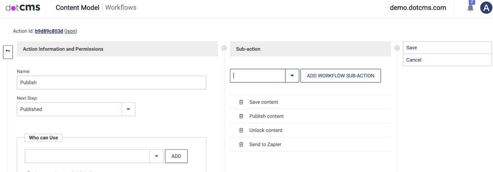 By installing the plugin, a new "Send to Zapier" Workflow Sub-Action becomes available. Add this to any Workflow action to create a trigger for a Zapier interaction from the dotCMS end.