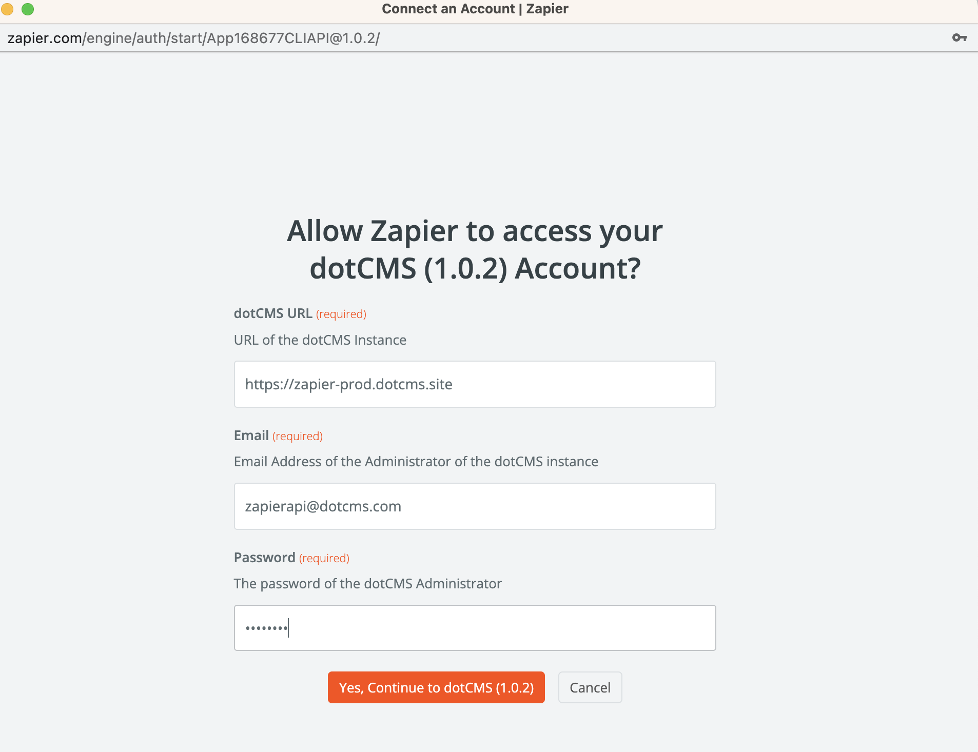 You'll be prompted to select a user. You may need to select + Connect a new account at this time. Provide the root URL of your dotCMS instance, and the email address and password of the dotCMS account that will be associated with the dotZapier plugin use — that is, allowing Zapier to sign in as that account. It is strongly recommended that you create a unique account for this, to better limit permissions to the relevant content types or workflow actions according to use case.