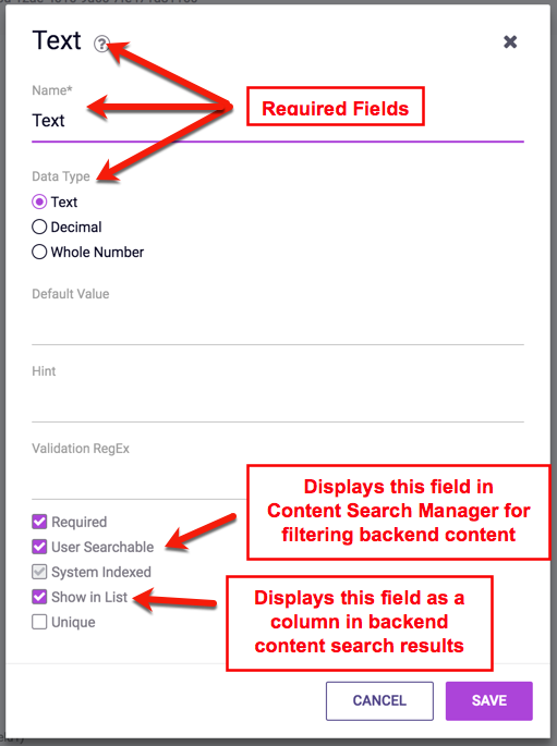 | Field Display Type | Required | User Searchable | System Indexed | Show in List | Unique |