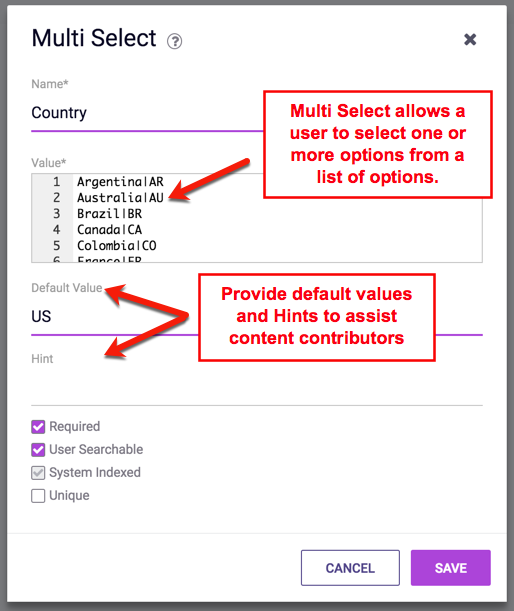 | Hint | Text | Instructions to contributors on how to fill out the field. The Hint will be displayed to the content contributor on the Content editing screen. |