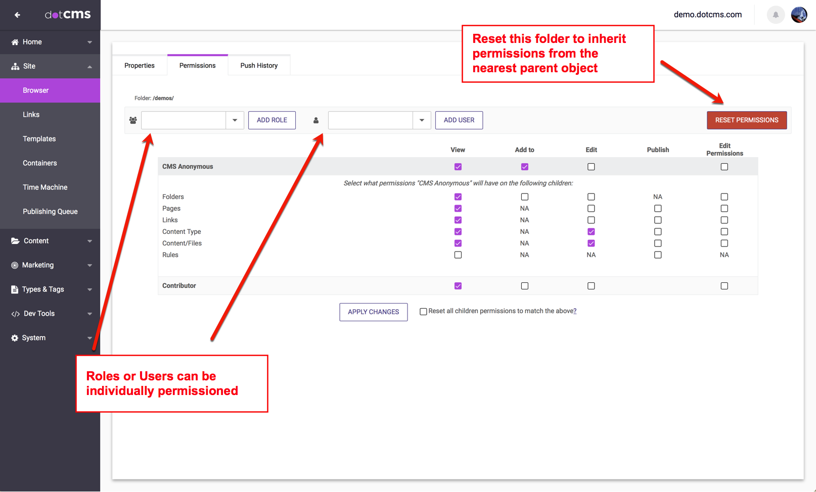 Although permissions can be set and inherited from the system host or set individually on folders and objects from the Website tab, as a general rule larger implementations will find setting permissions from the system host to be a more efficient and centralized permissions management strategy whereas smaller implementations may prefer the convenience of setting permissions on objects from the the Site Browser tab. The dotCMS is flexible and allows users to implement their own permissions management style using either method.