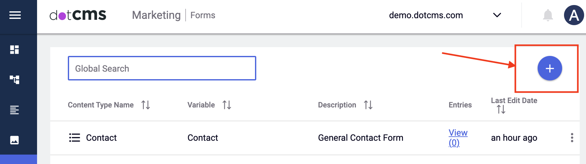 Users who are permissioned to create forms can hover over the Marketing category on the left sidebar and click on "forms" from the drop down menu. From the forms tab users can click on the plus sign button in the top right of page the to create a new Form.