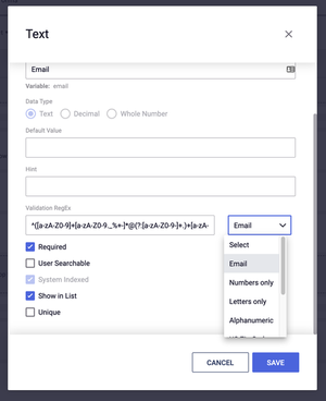 - Next select the pattern you would like the field to follow from the RegEx drop down menu