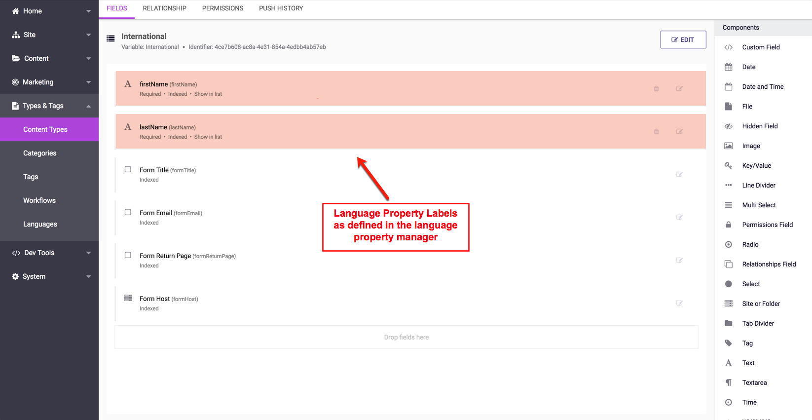 First Name and Last Name set in English (note that the language property can't have spaces or special characters):