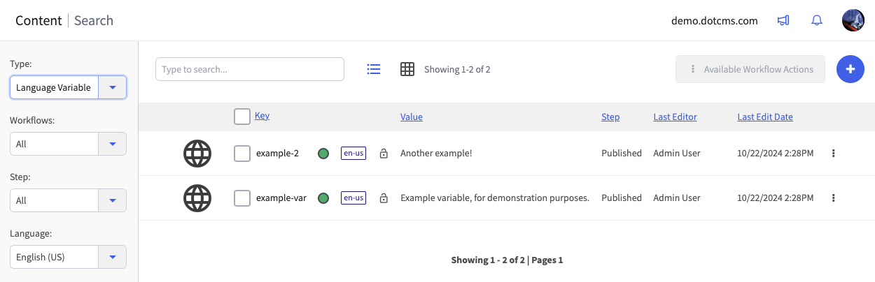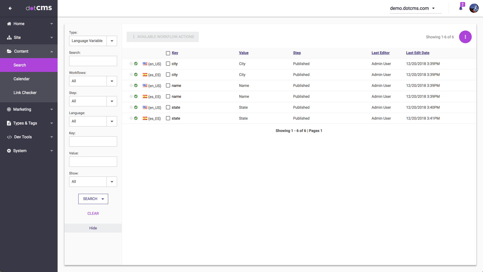 A fully multi-lingual site will need to display all site elements in different languages, including not just content but also common elements such as navigation menus, buttons, header and footer images, etc. You can enable a single Template, content, or other dotCMS object to support multiple different languages using Language Variables. Language Variables allow you to create multiple versions of the variable in different lanaguages, all of which use the same key, but have different values depending on the language. You can then reference the key from within any element, and dotCMS will automatically return the appropriate value for the key depending on the user's chosen language.