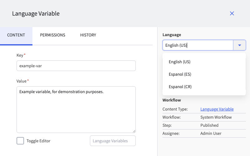 Language variables are managed as content; in each such contentlet, you can use the standard language selector to switch between different language versions of the same text. For example, in this system, there are three defined locales: