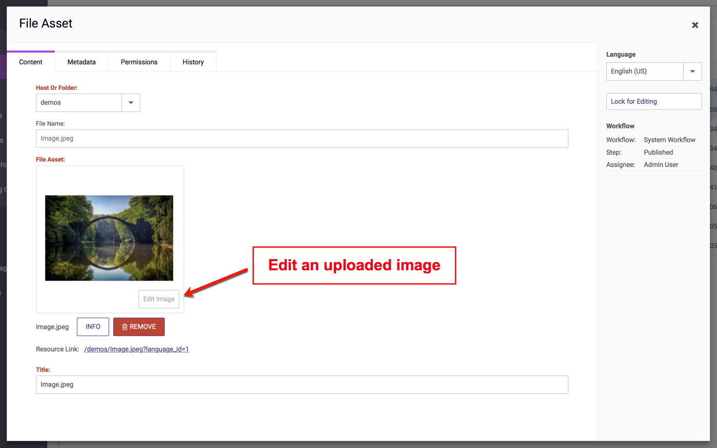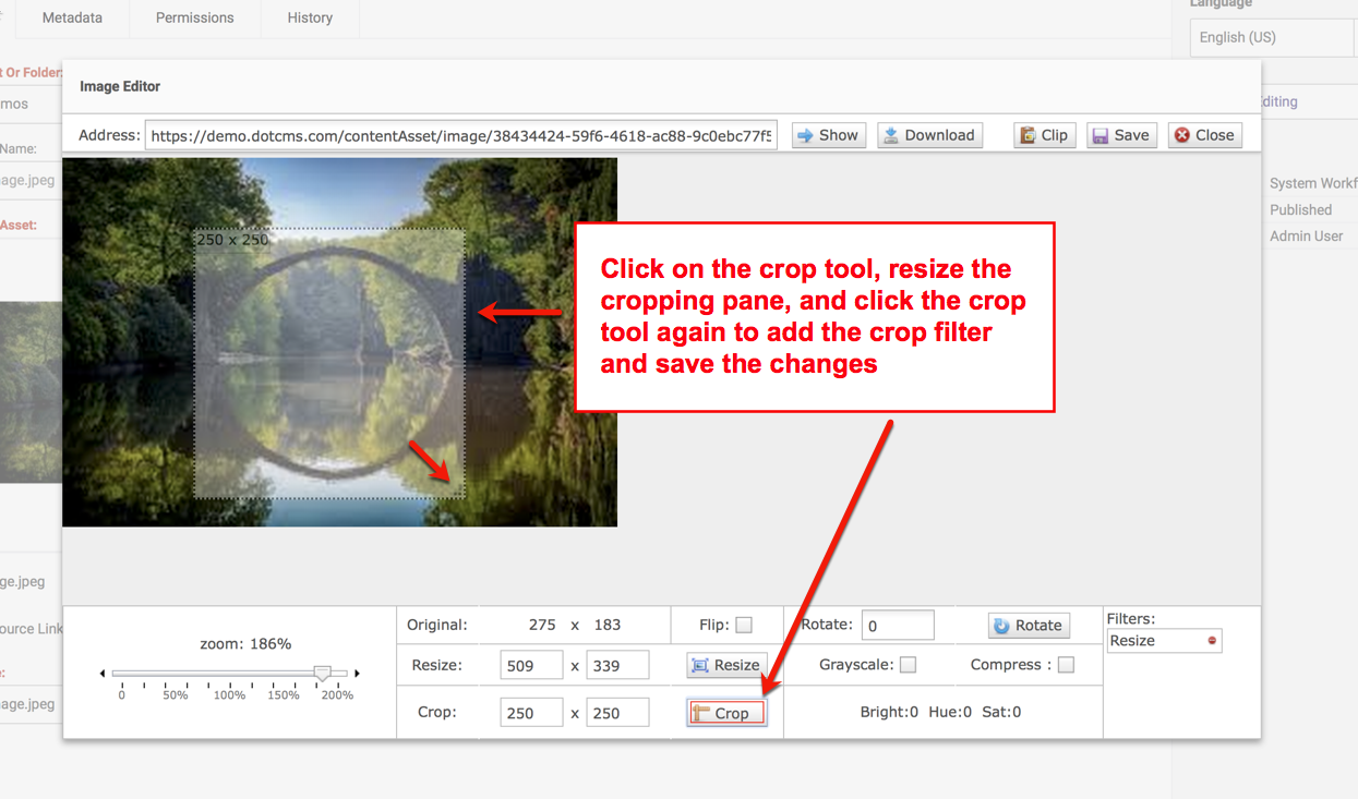 dotCMS offers an image editing tool for the modification of uploaded image/binary image file types.