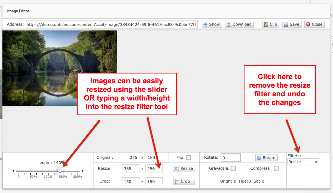 In the example below, the original image is being resized to 25% of its original width using the resize slider. Alternately a width or height can also be typed into the resize dimensions boxes provided to resize the image. The image editor will scale the image proportionally so that no stretching is allowed when image sizes are adjusted. Remember that ANY changes to an image can be undone by clicking on the name of the filter under filters:
