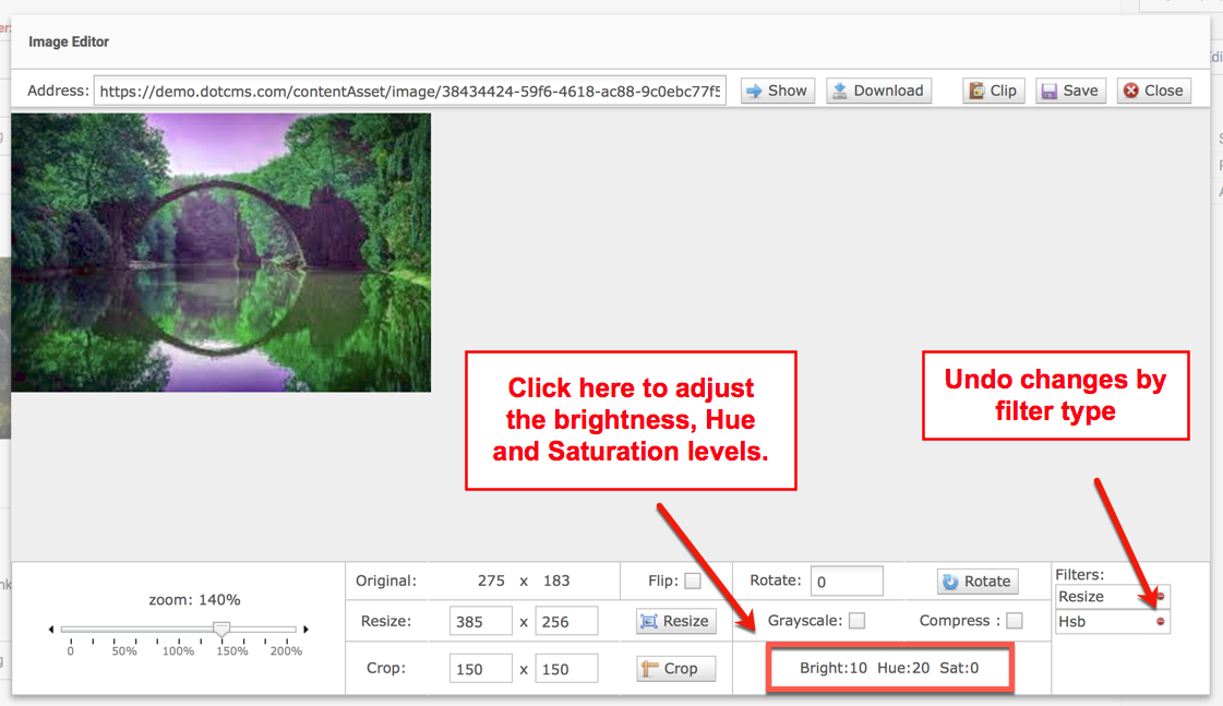Once the image is properly edited and ready for placement inside a piece of content, simply click the "clip" button at the bottom of the image editor to save the image to the dotCMS Image Clipboard. Then save the desired changes to the image by clicking the save button.