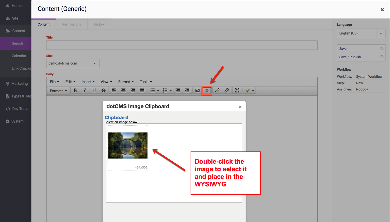 Now that the image has been edited, saved in the dotCMS Image Clipboard (in the image editor), and saved, the image can then be placed in a WYSIWYG field in any piece of content by clicking on thedotCMS Image Clipboard tool button in the WYSIWYG.