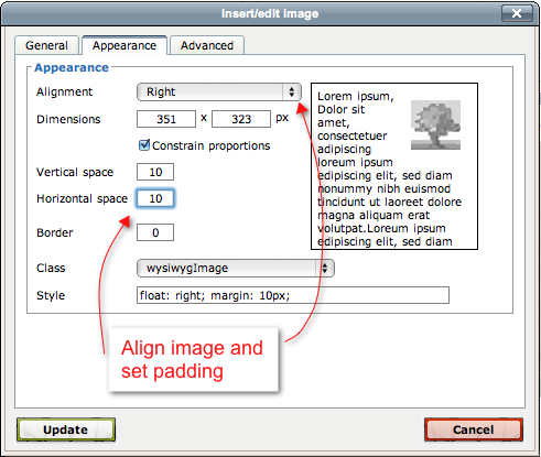 After placing the image in the WYSIWYG, click on the image and then click the image icon in the WYSIWYG toolbar to edit the General, Appearance, and Advanced image properties (see below). This will allow for the quick addition of padding, borders, alignment, etc, on the image.