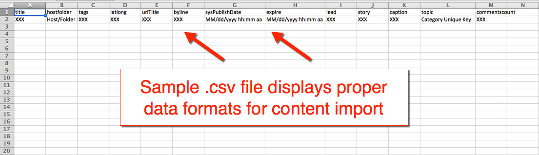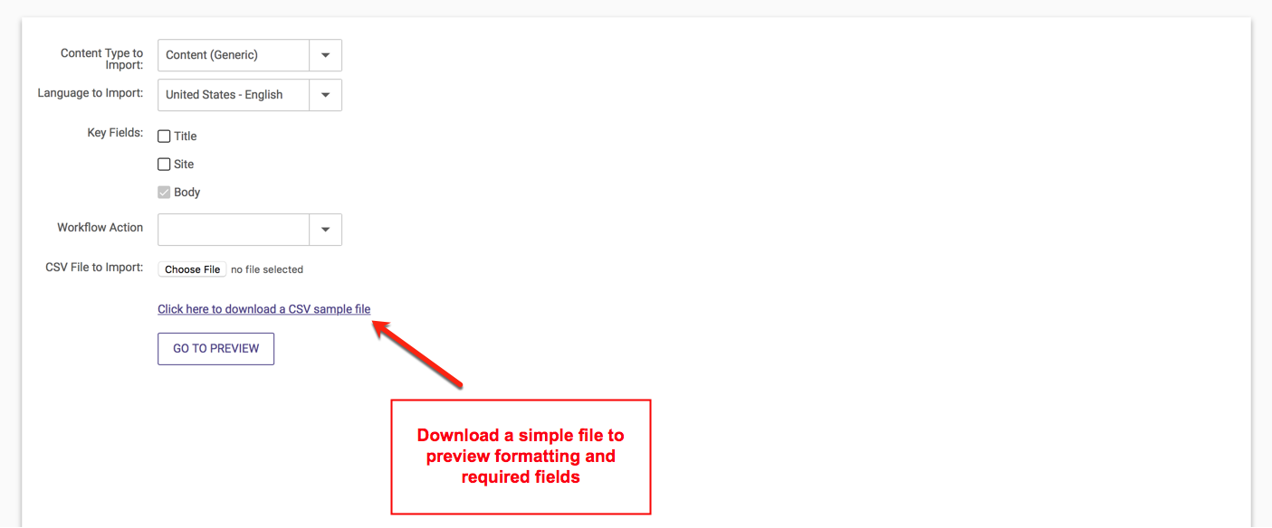 - If you are not sure about the formatting of a particular column heading, please preview fields in your selected Content Type prior to importing content.