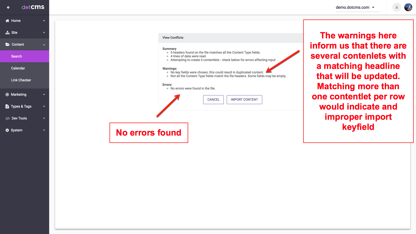 - If no dotCMS content exists that matches the value in the identifier column, then dotCMS will attempt to match the values of any Key Fields in the imported content.