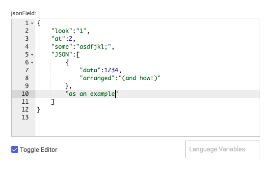 Screenshot of a JSON field in the user interface, with the editor view toggled.