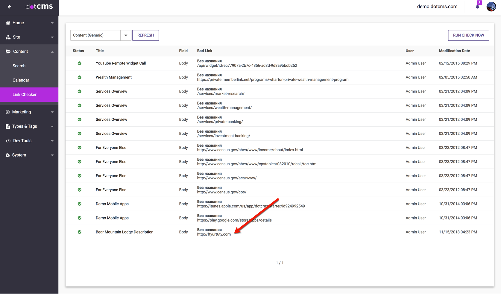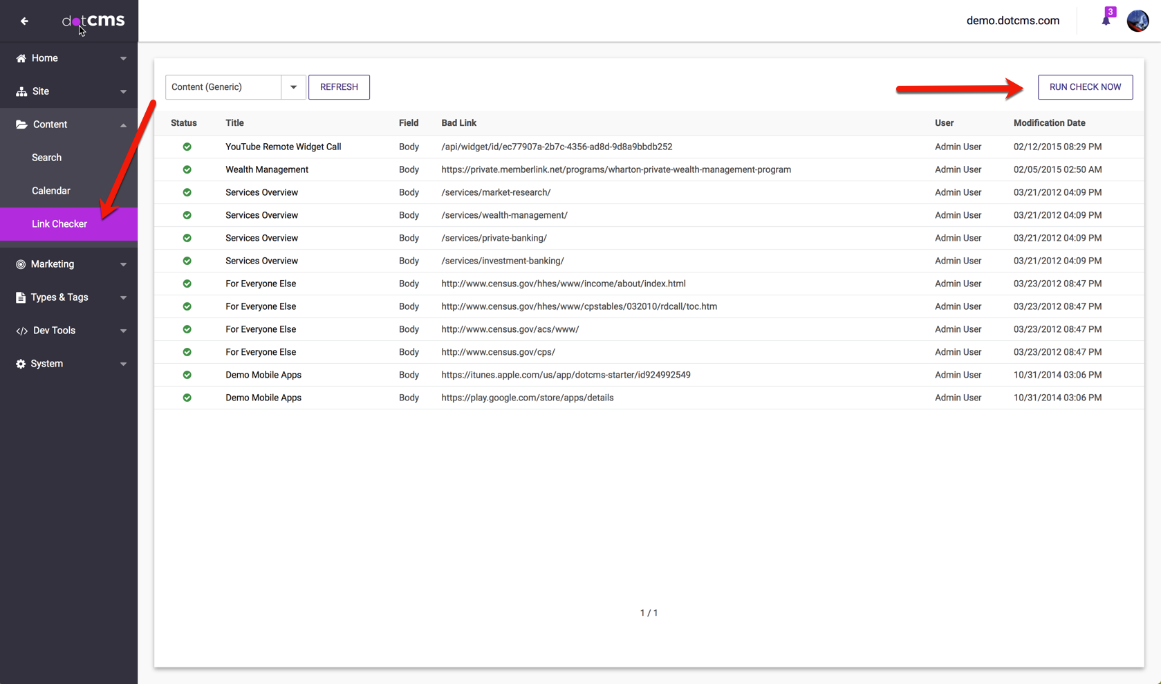 The Link Checker feature is deprecated; dotCMS recommends the use of a third-party tool to perform link audits, such as: