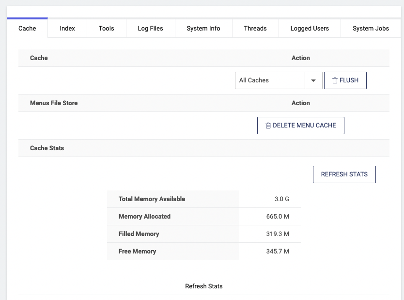 Manage and view statistics on site caches from this tab. To view the full listing of all active caches, along with their sizes and TTLs, click the Refresh Stats button under Cache Stats.