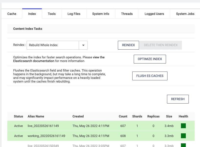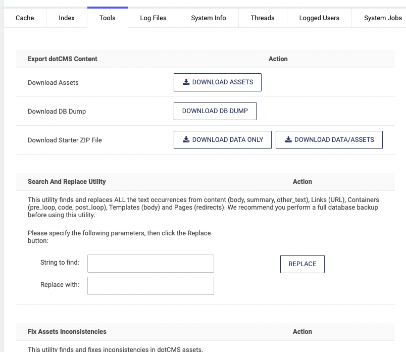 The back-end maintenance tasks listed in this section can have adverse site-wide repercussions if not executed properly. Only trained dotCMS content architects, system administrators, or developers should attempt these maintenance tasks. It is recommended that a dotCMS backup be conducted before executing certain high-risk maintenance tasks.