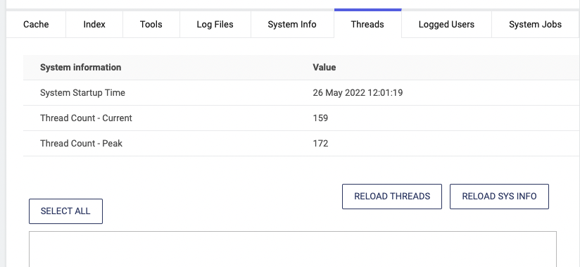 From Threads, you can view current and peak thread counts, perform stack traces on individual threads, or generate thread dumps.