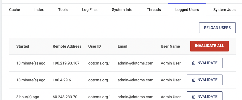 Logged Users displays basic information about users currently logged in and permits the invalidation of active sessions.