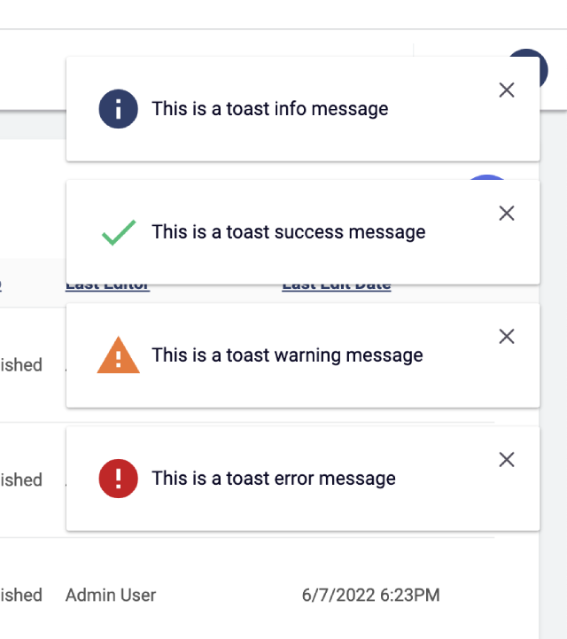 $messagetool.sendInfo('This is a toast info message', 25) $messagetool.sendSuccess('This is a toast success message', 25) $messagetool.sendWarning('This is a toast warning message', 25) $messagetool.sendError('This is a toast error message', 25)