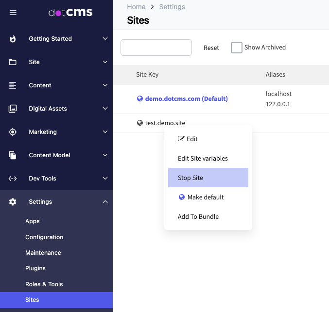 Sites in dotCMS follow a defined lifecycle: Active → Stopped → Archived → Deleted. Each transition requires the previous step to be completed first.