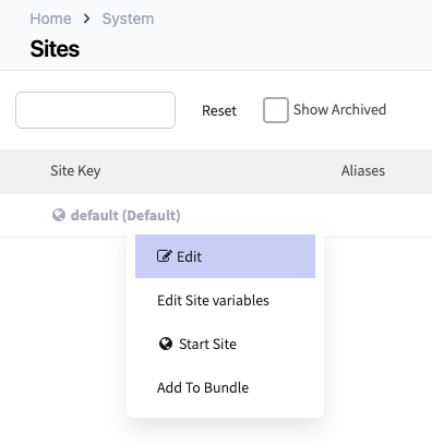 Note: The default site cannot be archived. To archive a site, first assign a different site as the default.