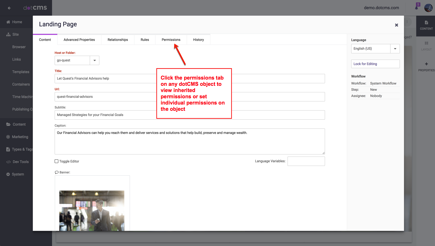 By default, all objects in dotCMS inherit Permissions from their parent object. This highest level object in the system is the System Host (sometimes referred to as "All Hosts"). Sites inherit Permissions from the System Host, Top-level folders inherit Permissions from the Site, and sub-folders inherit Permissions from their parent folder.