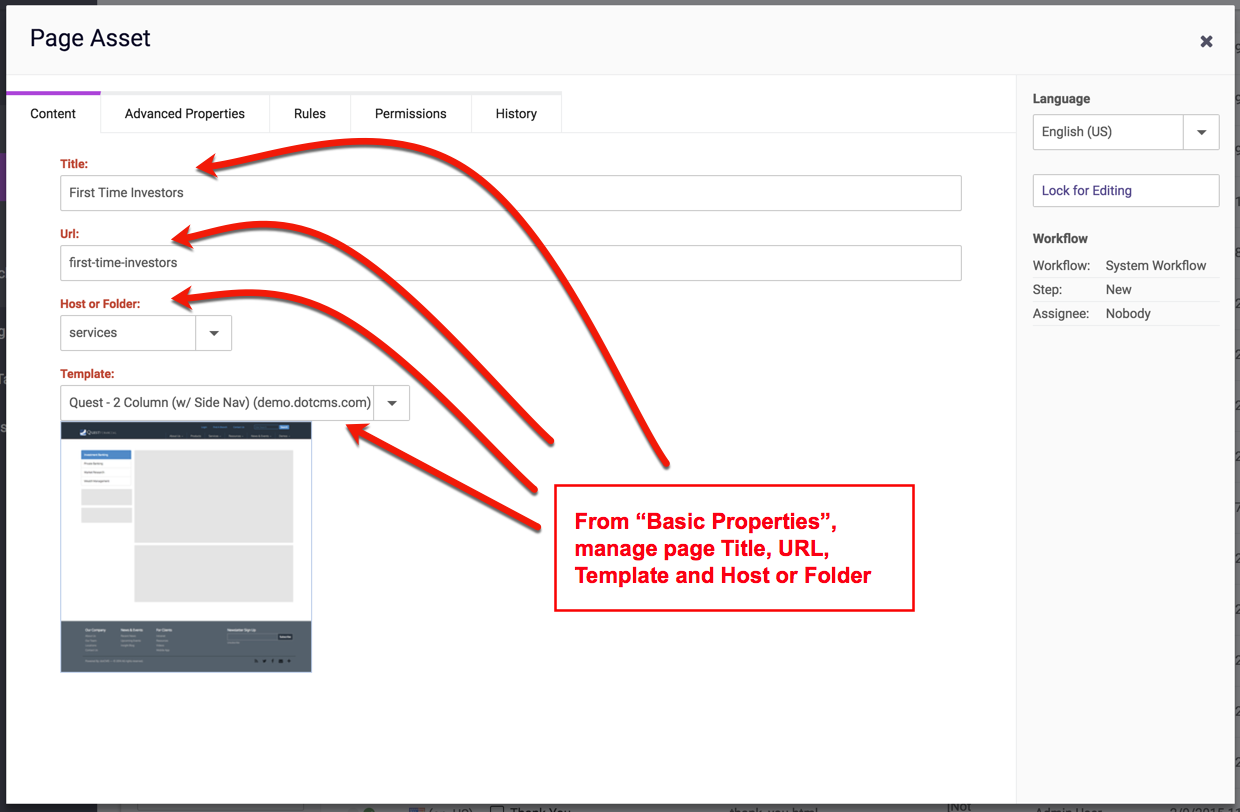 When editing a Page in dotCMS, there are some basic required fields needed for the page to exist, such as the Title, Host or Folder, URL, Cache TTL, and Template fields. However, additional "Advanced Properties" can be added to a Page by clicking on the "Advanced Properties" tab.