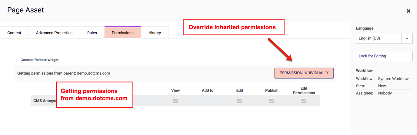 For more information on setting permissions on dotCMS objects from the System Host, please see the documentation on Role Permissions.