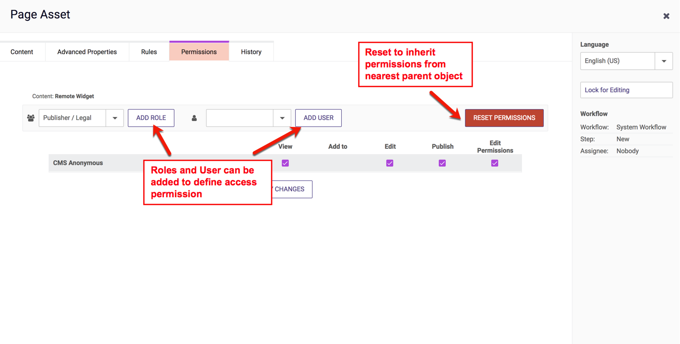 Below is an image of a Page that is inheriting all its permissions from the "System Host". This means that permissions on this Page, "parent" folder, and Site above it, are inheriting permissions directly from the Role permissons themselves set at the *System Host level.