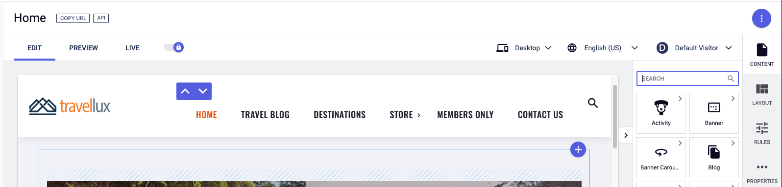 The Visitor Menu lets you display personalized versions of Page content, using visitor Personas. Selecting a Visitor Persona sets the Persona on the page, triggers Rules, and re-renders the page to display the appropriate personalized content (if any exists).