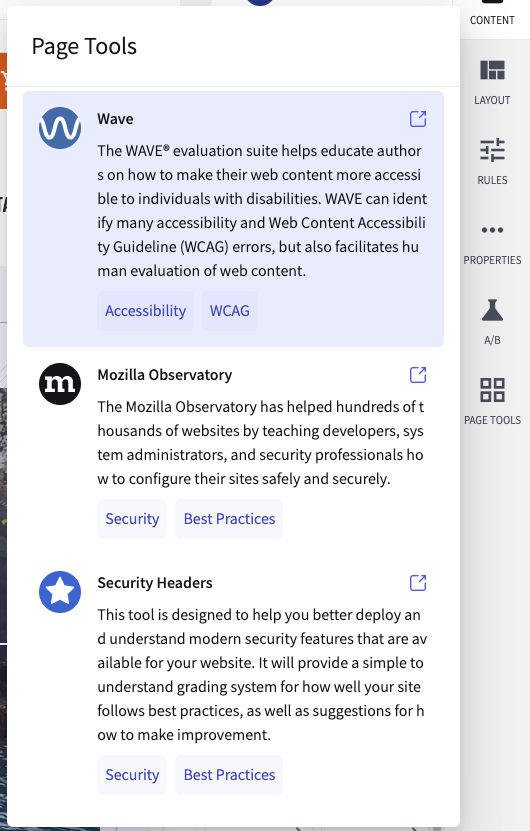 | Page Tools | Provides a panel of links to services to help evaluate a page against best practices on security, accessibility, etc. (See below.) |