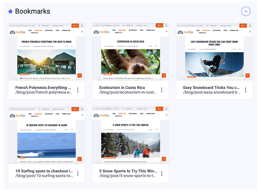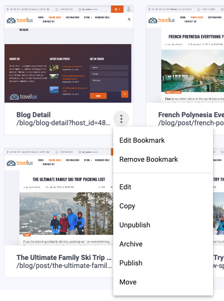 You may also remove or edit a bookmark from within the bookmarks pane at the top of the Pages Tool; just click the same hamburger on an item within the pane. In addition to editing or removing the bookmark, you can edit the Page or contentlet itself, or perform Workflow Actions on them. (Note that some workflow actions may require a contentlet to be in the correct workflow state to receive it.)