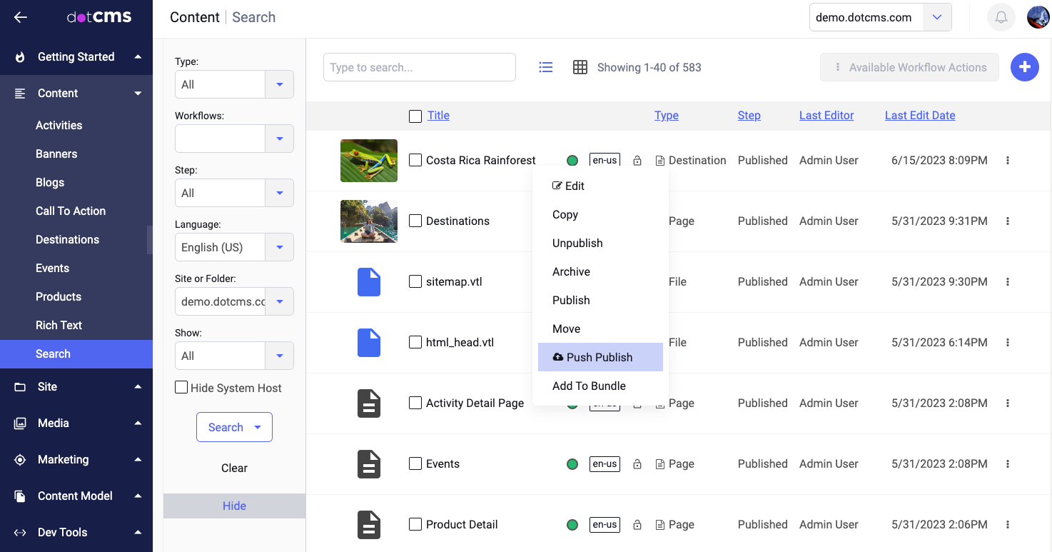 On the Content Search screen, you can also select multiple content items for push publishing at the same time. Select the checkboxes for all the items you want to push publish, click the Available Workflow Actions button at the top of the screen, and then select the Push Publish button from the popup.