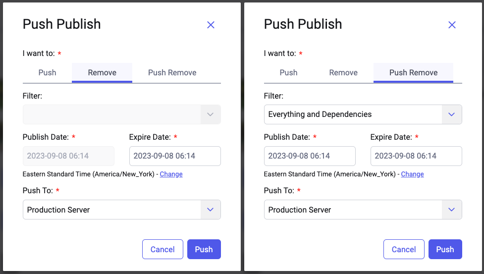 Whenever you select Remove or Push Remove in the Push Publish dialog, you schedule dotCMS to unpublish on the specified Expire Date. At the specified date and time, dotCMS will unpublish and delete the pushed content from the receiving Endpoint.