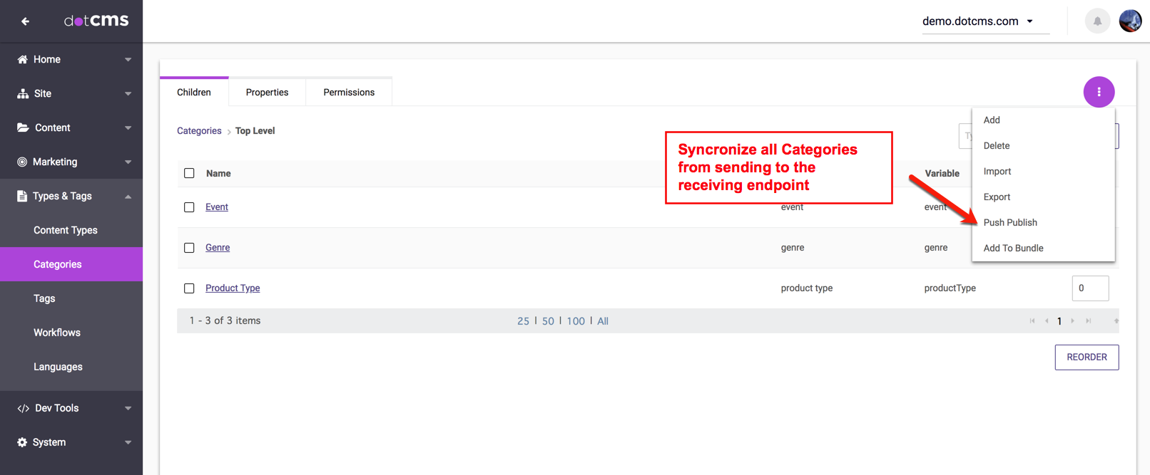 All Categories can be synchronized from one Dynamic Push Publishing Endpoint to another using the Content Types → Categories manager, in addition to being pushed as a dependency of content.