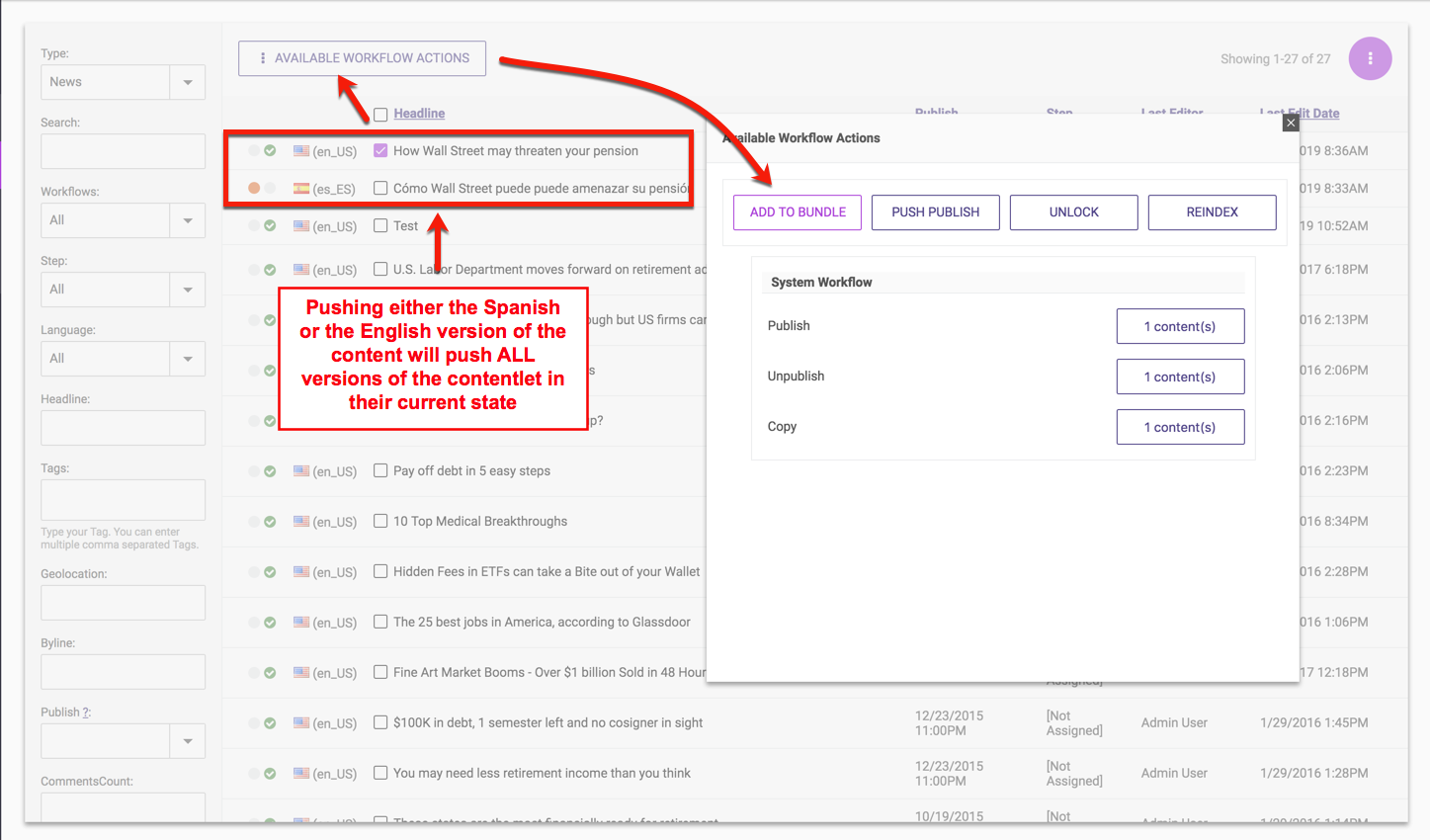 Note that content will never change state because of a push publish operation. If a piece of content exists with an unpublished version in Spanish and a published version in English, and EITHER language version is pushed, then the Spanish version of the contentlet will be pushed to the receiving server in its unpublished or "draft" state and the English version will be delivered to the receiving endpoint as a published piece of content.