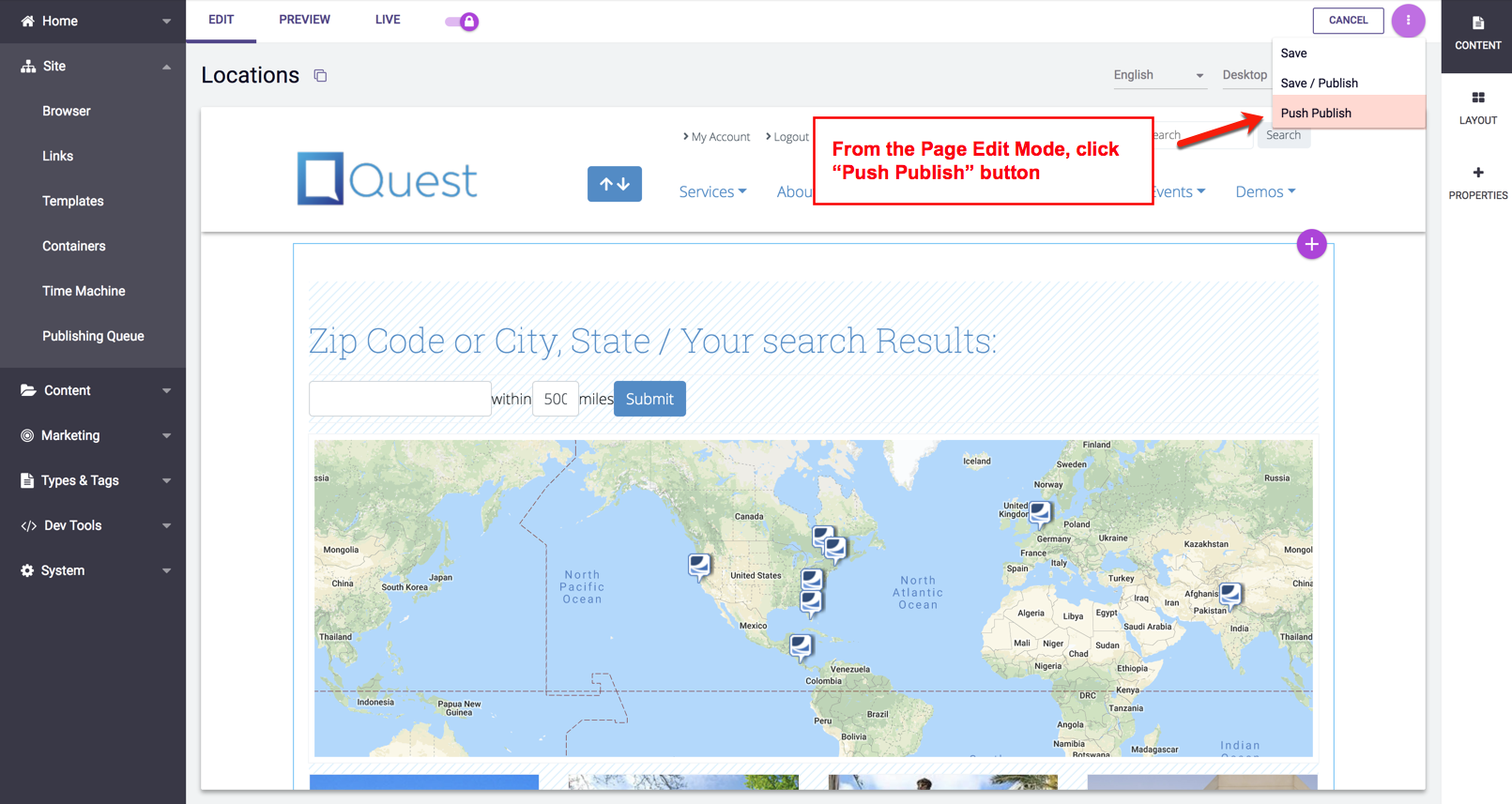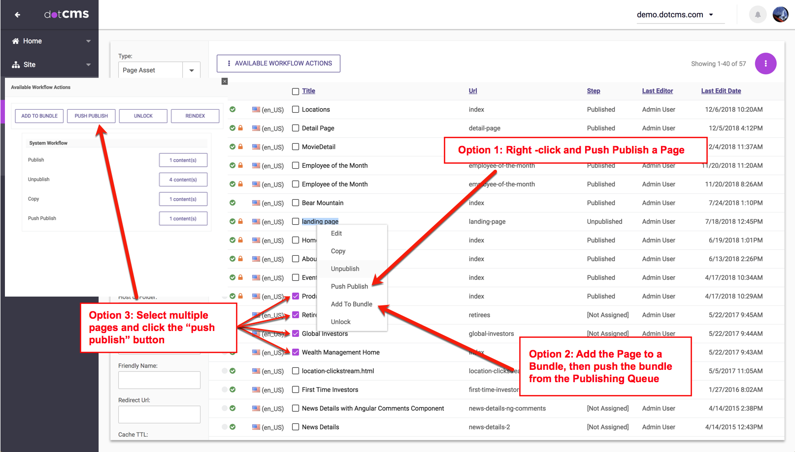 There are three different ways to Push Publish a Page from the Content Search screen: