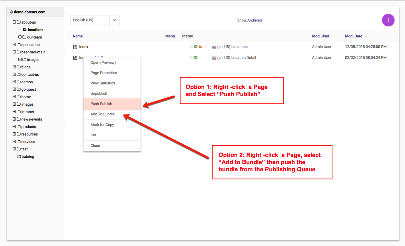 - Right-click and Push Publish on an individual Page in the Content Detail area