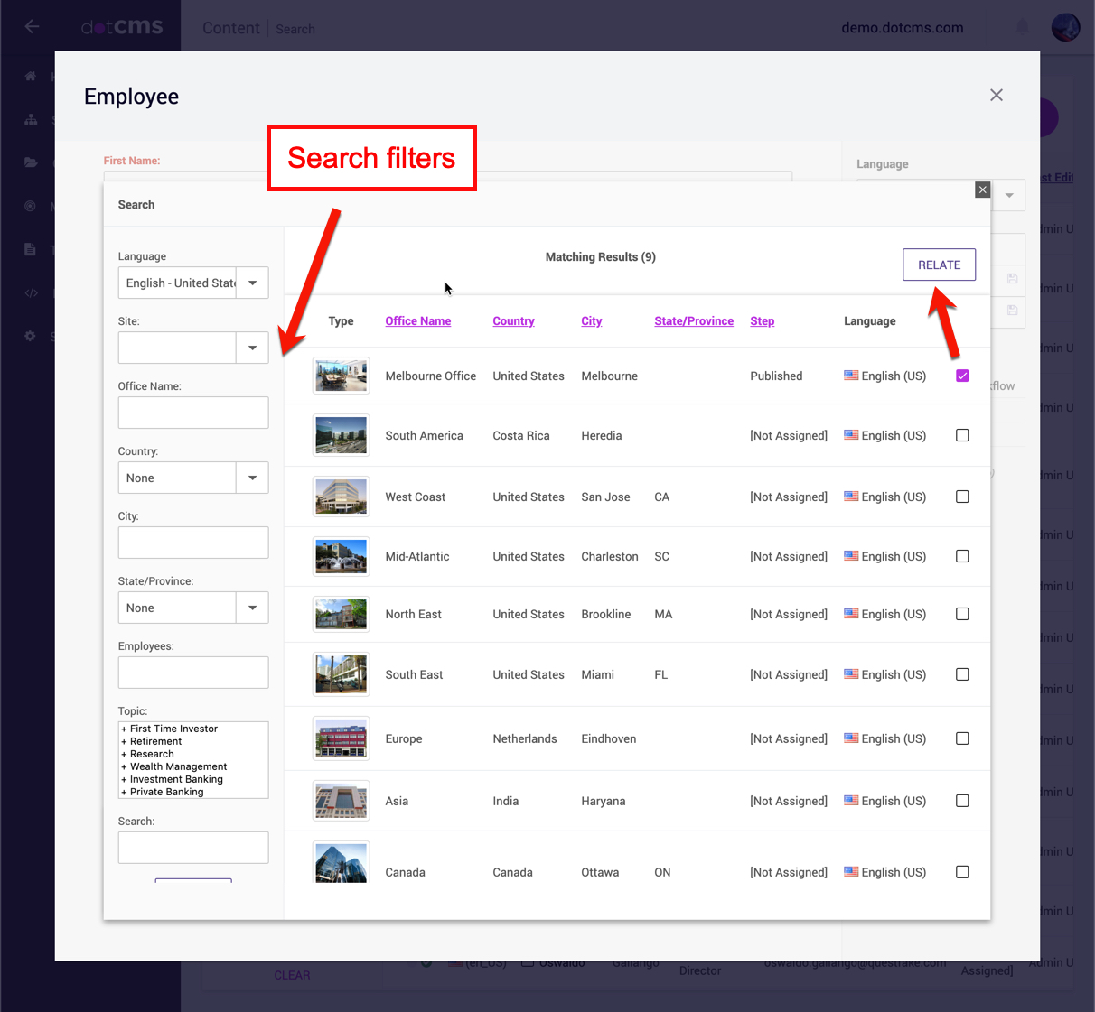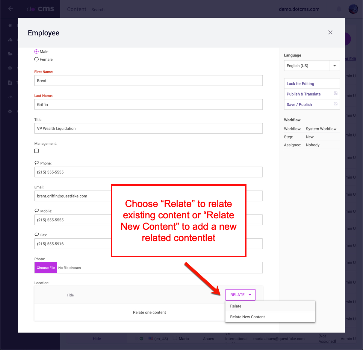 The Relationships Field allows content publishers to choose "Relate" to search for an existing piece of content to relate, or "Relate New Content" to add a new piece of related content to the one currently being edited. In the example below, choosing "Relate New Content" will allow a new office to be added and simultaneously related to the current employee being edited.