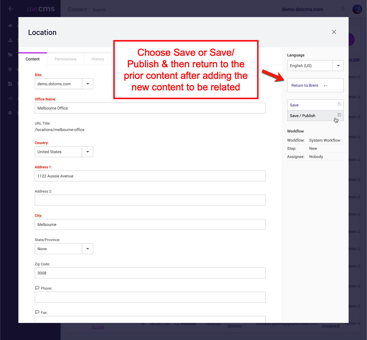 After Saving or Publishing the new content that should be related to the prior content, in this case a new Office Location will be added to the system and related to an employee named Brent, then click the Return to:{content name} button to verify that the new content has been both added and related to the original content.
