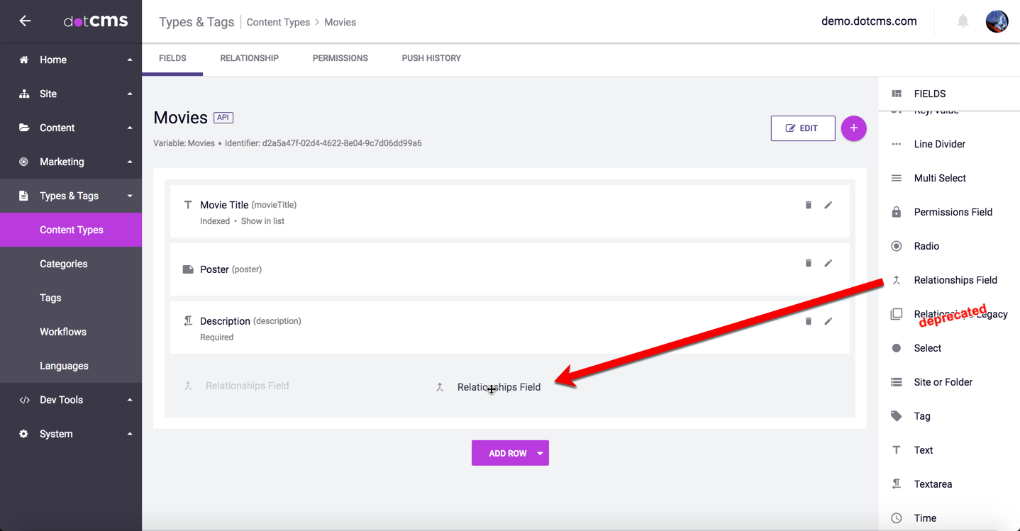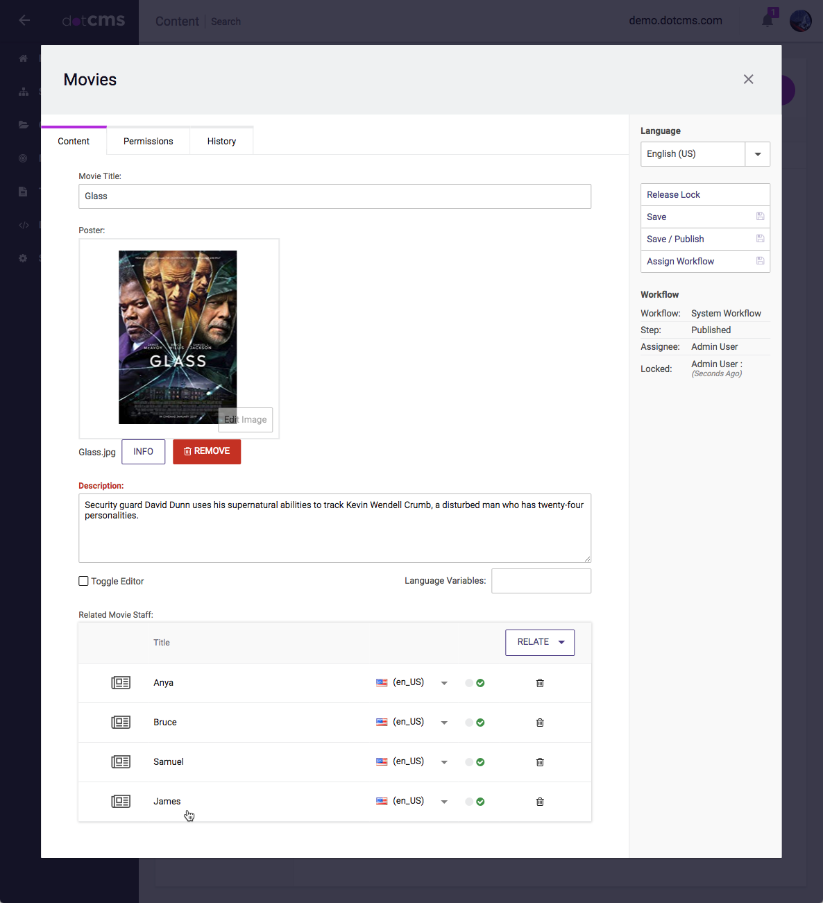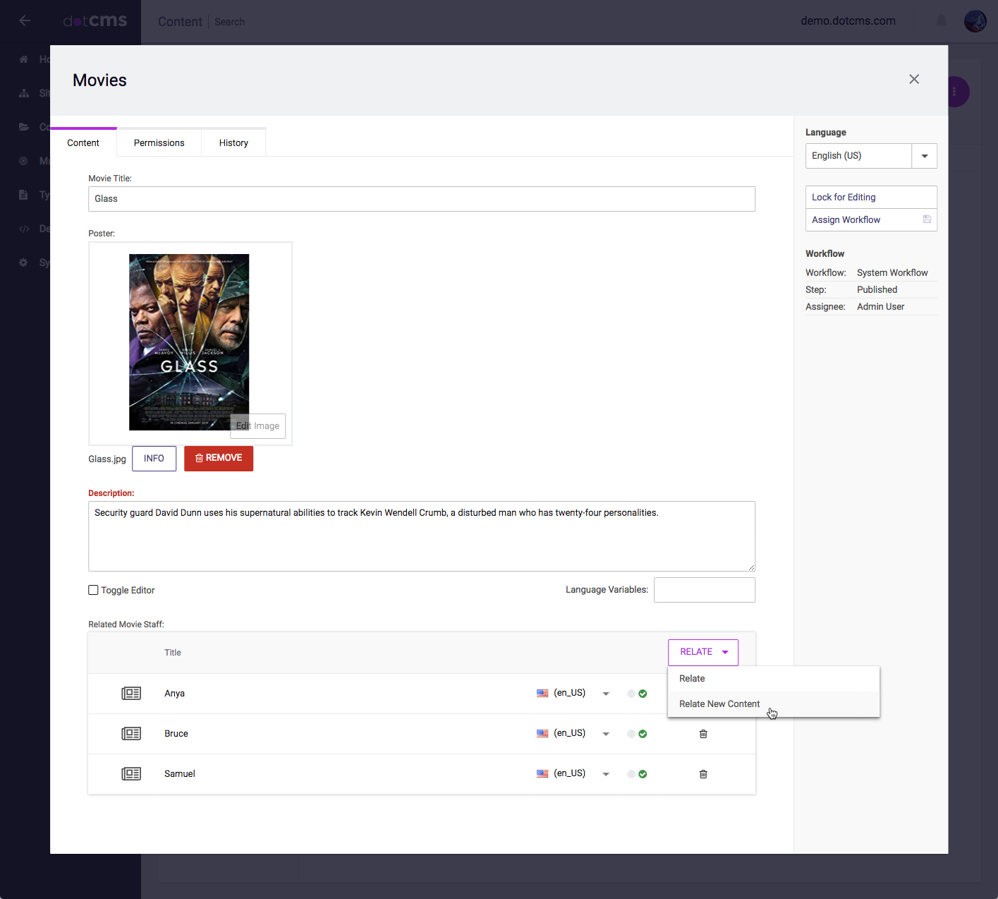 For example, when adding a content item of an "Movie" Content Type, you might want to add a relationship from the "Movie" contentlet to a "Movie Staff" type of content so that dynamic page listings can show pulls of Movies that show a listing of the cast, and conversely, actor/actress/director detail pages that show listings of all the movies they have worked on. Any type of content can be related to another using relationship fields. Content Types can also be related to the same content type. The dotCMS documentation site, for example, utilizes a single content type, and documentation content is related to other documentation content at several levels and are organized and pulled entirely by their relationship to each other.