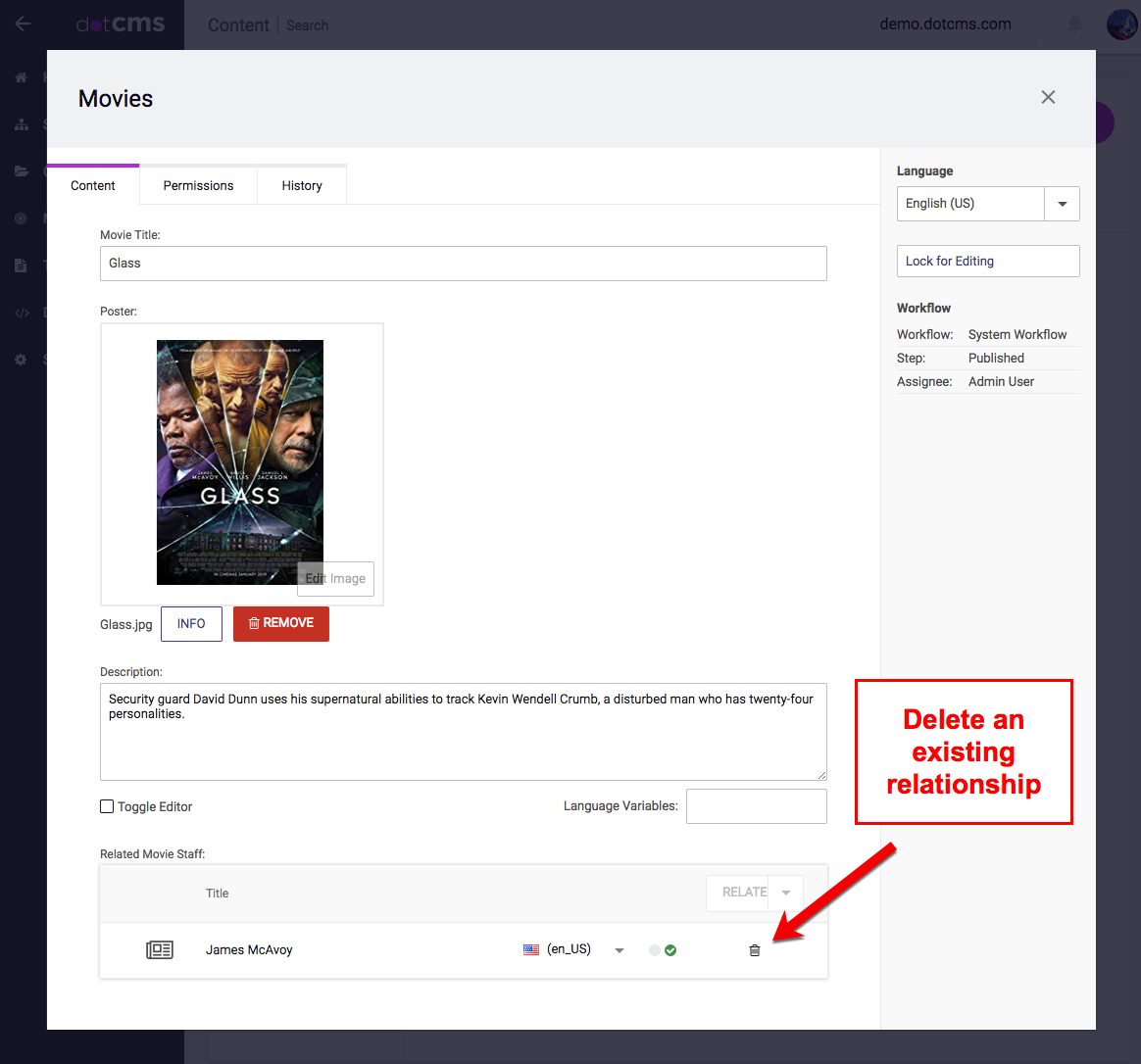To delete a Relationship between two pieces of content, click the trash can icon to the right of the related content in the relationship field.
