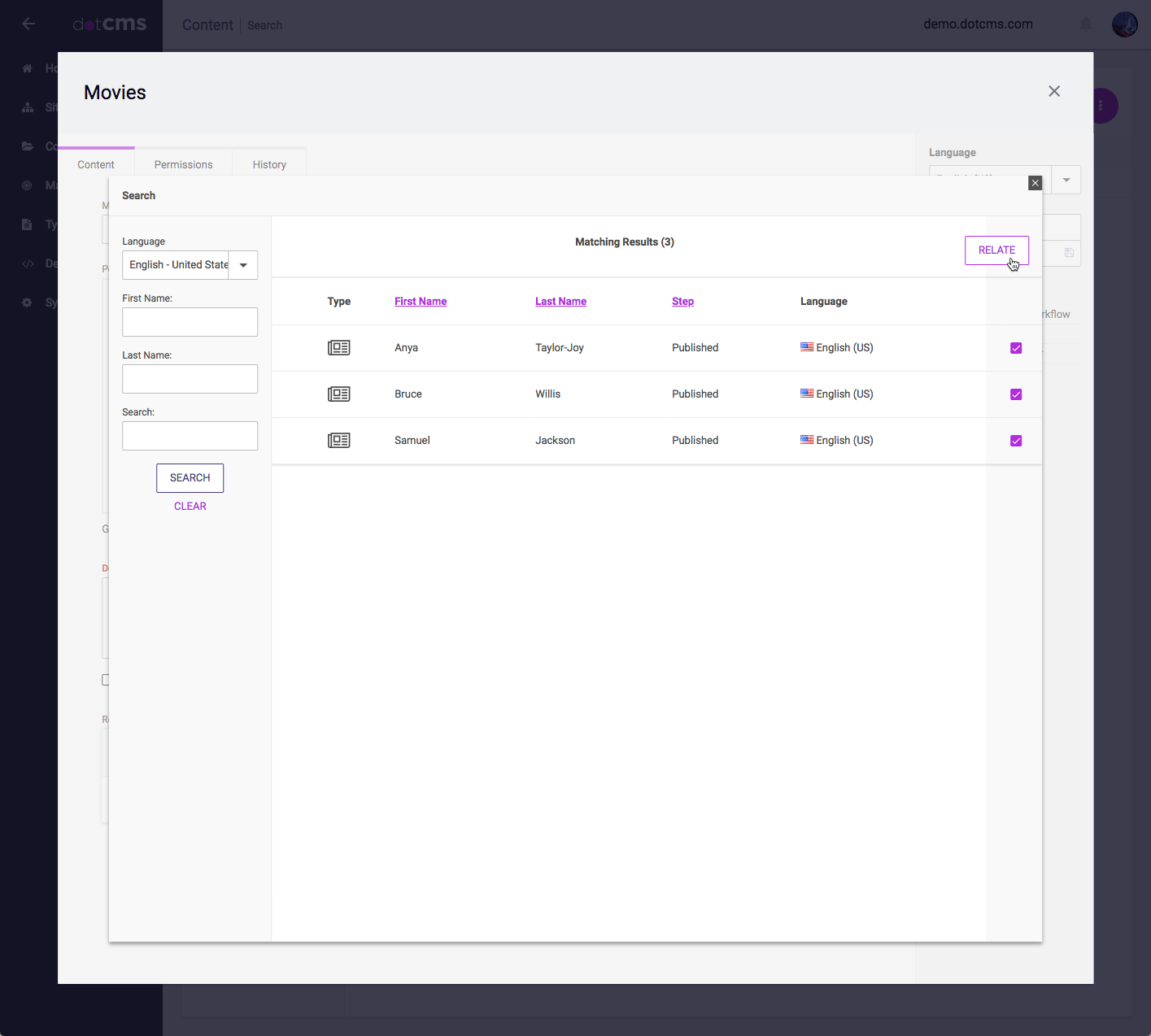 If the Relate option is chosen, content contributors can then search and choose one or more existing contentlets (using checkboxes) to relate the selected content to the current content being edited.