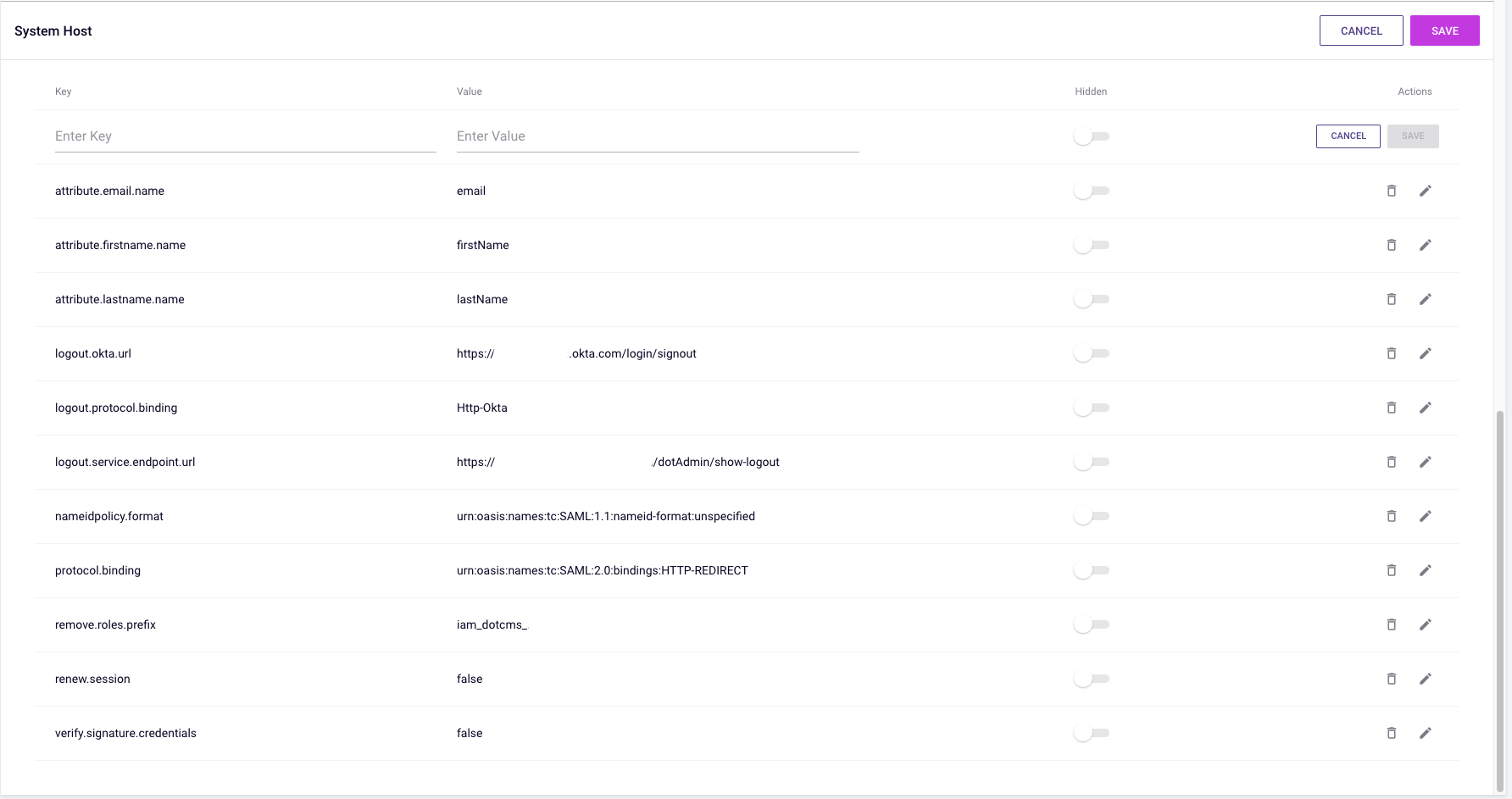 Below are a list of custom attributes from a working OKTA installation. The value containing "ClientDomain" should obviously be replaced with correct values for the Okta endpoint and the dotCMS server location. If you are cutting and pasting, please make sure not to include leading or trailing spaces in the values.